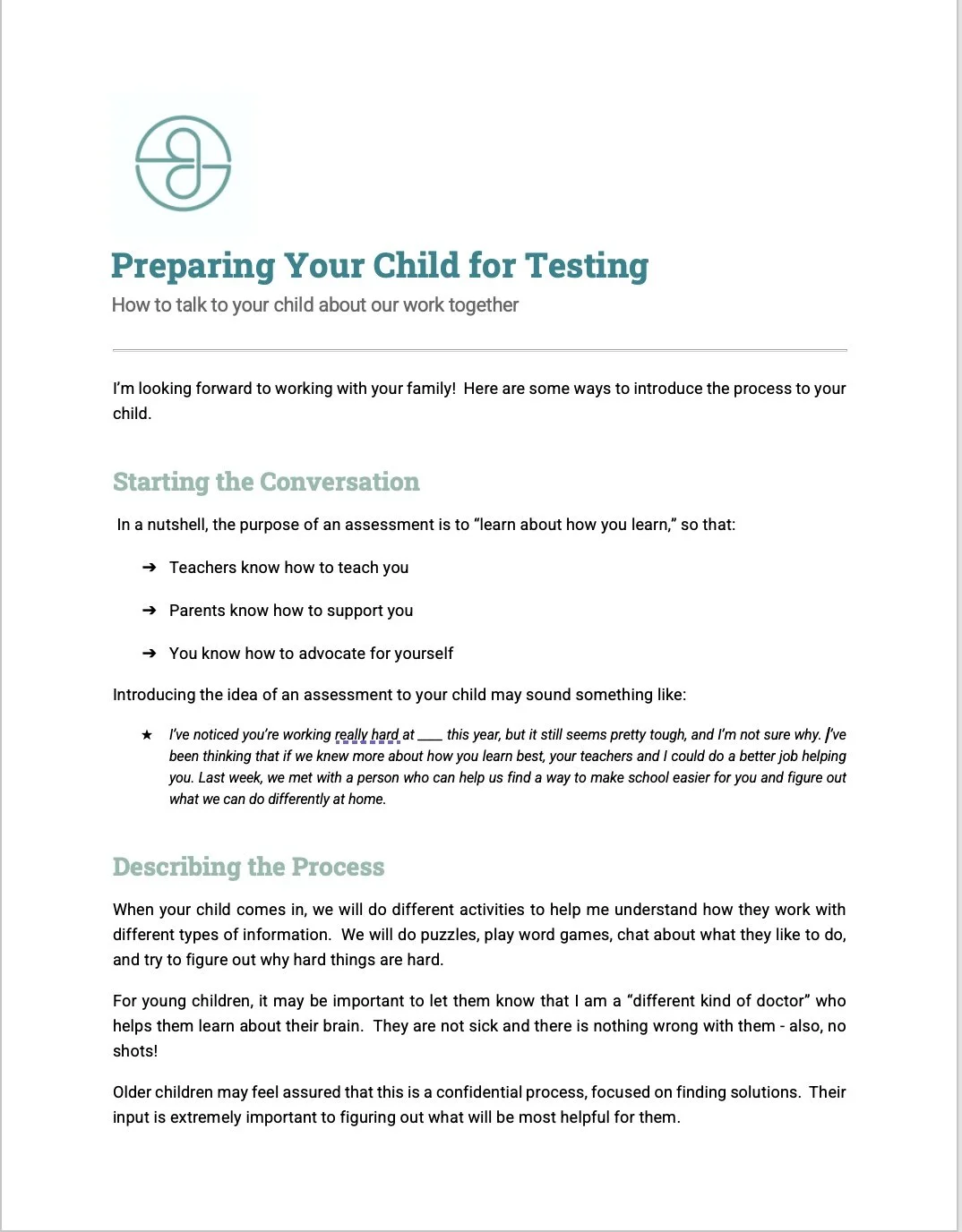 It's essential to demystify the assessment process for your child. Explain that it involves various activities, such as puzzles, games, and discussions, aimed at understanding their learning style and strengths. Assure them that it's not about being sick or doing something wrong – it's about learning how to make learning easier and more enjoyable for them.